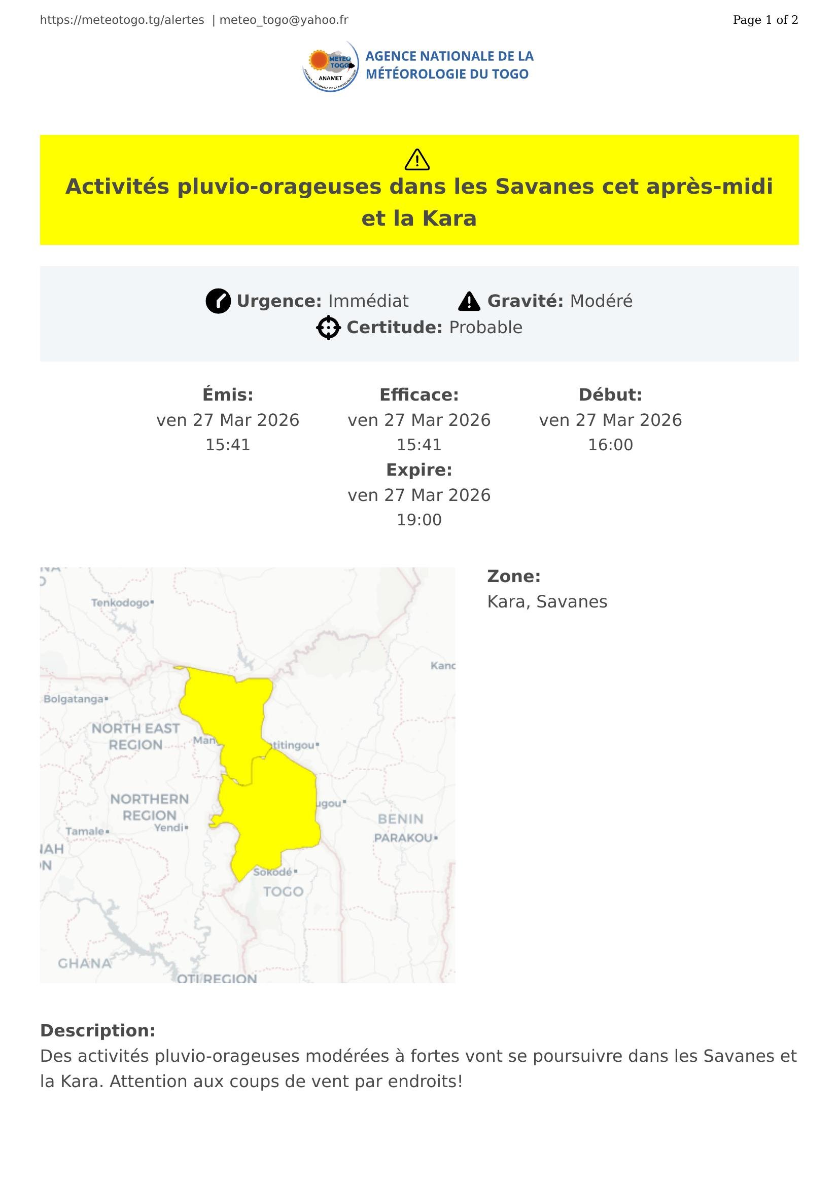 Des activités pluvio-orageuses modérées à fortes vont se poursuivre dans les Savanes et la Kara. Attention aux coups de vent par endroits!