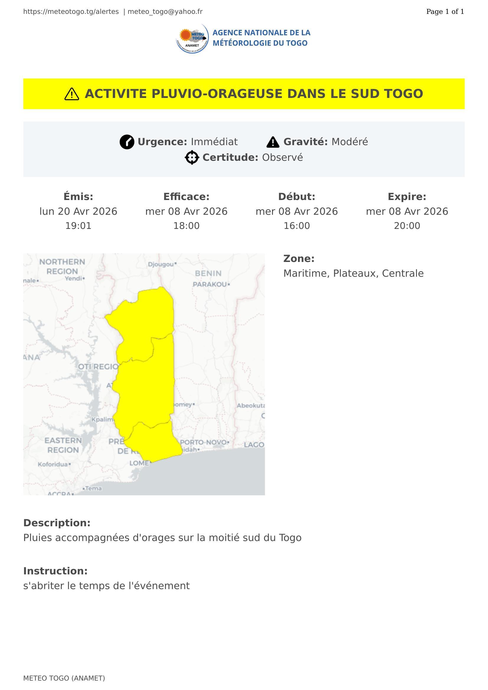 ACTIVITE PLUVIO-ORAGEUSE DANS LE SUD TOGO