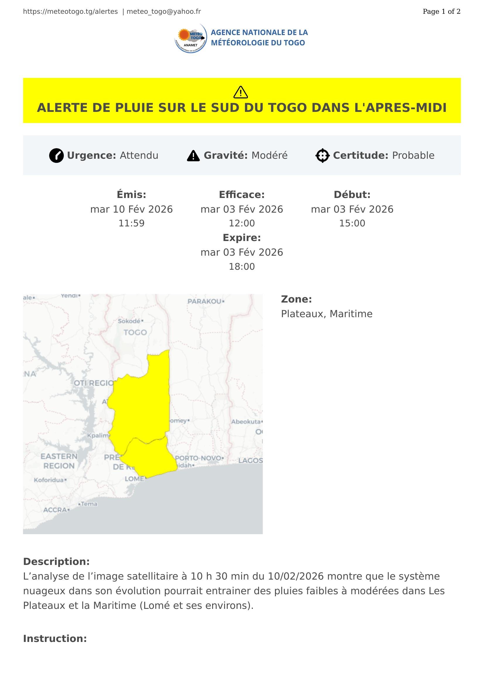 L’analyse de l’image satellitaire à 10 h 30 min du 10/02/2026 montre que le système nuageux dans son évolution pourrait entrainer des pluies faibles à modérées dans Les Plateaux et la Maritime (Lomé et ses environs).