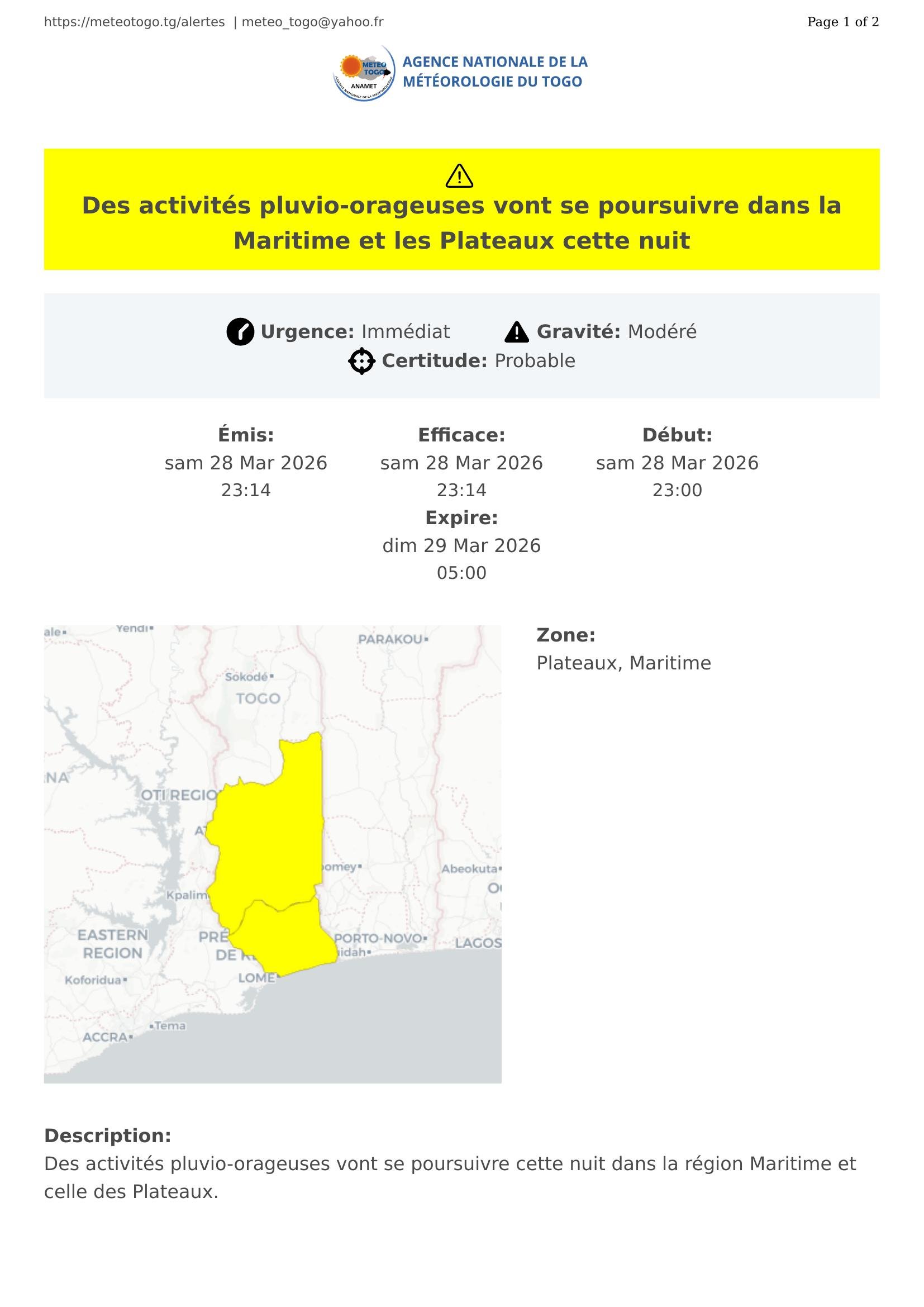 Des activités pluvio-orageuses vont se poursuivre cette nuit dans la région Maritime et celle des Plateaux.
