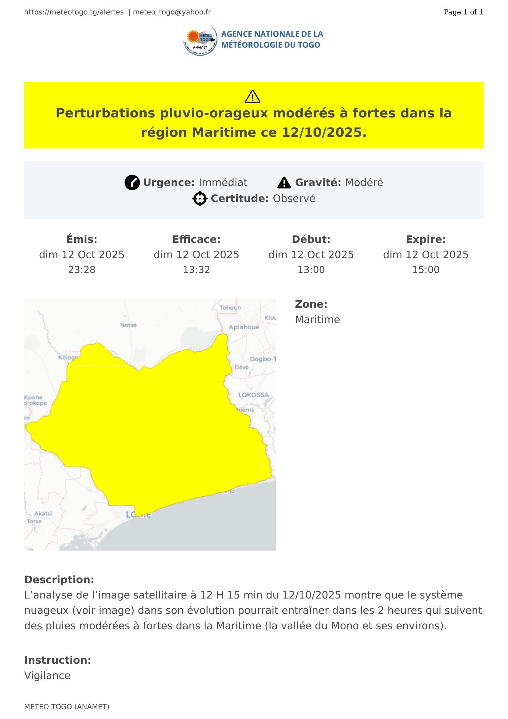 Perturbations pluvio-orageux modérés à fortes dans la région Maritime ce 12/10/2025.