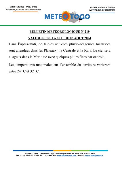 - Dans l’après-midi, de faibles activités pluvio-orageuses localisées sont attendues dans les Plateaux, la Centrale et la Kara. Le ciel sera nuageux dans la Maritime avec quelques pluies fines par endroit.